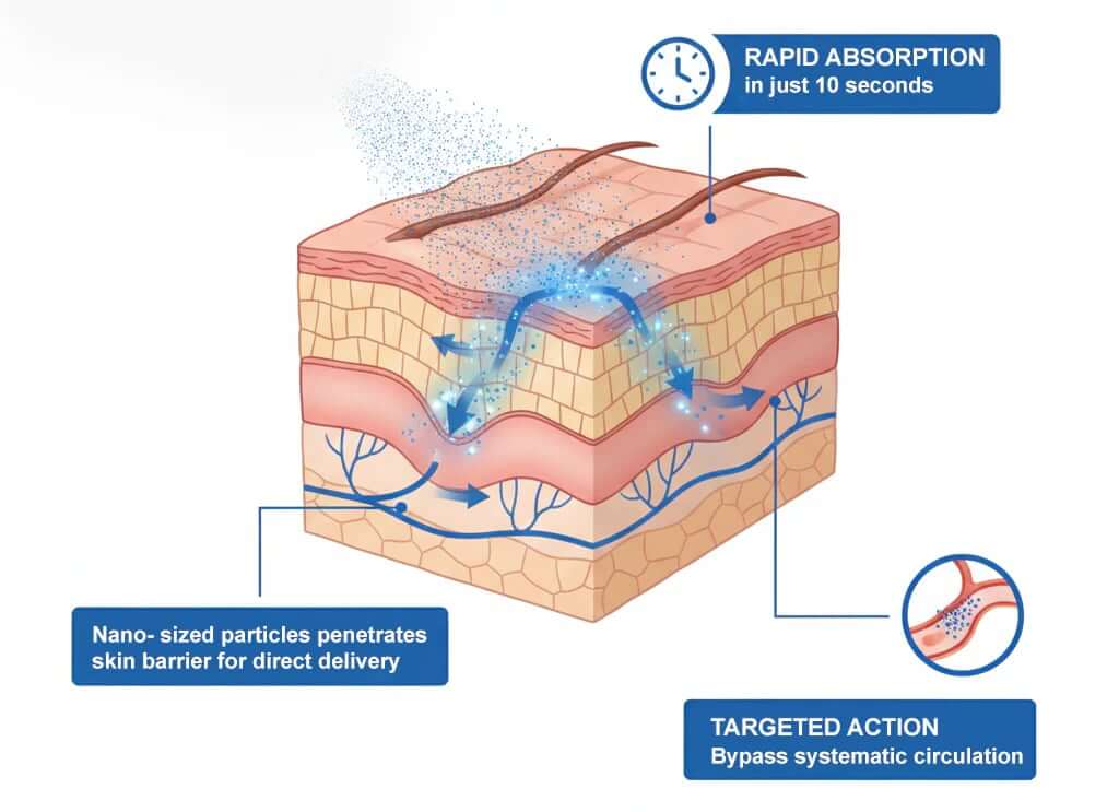 Σε αντίθεση με τα παραδοσιακά φάρμακα που χορηγούνται από το στόμα, το νανο-σπρέι μας έχει σχεδιαστεί για τοπική εφαρμογή: